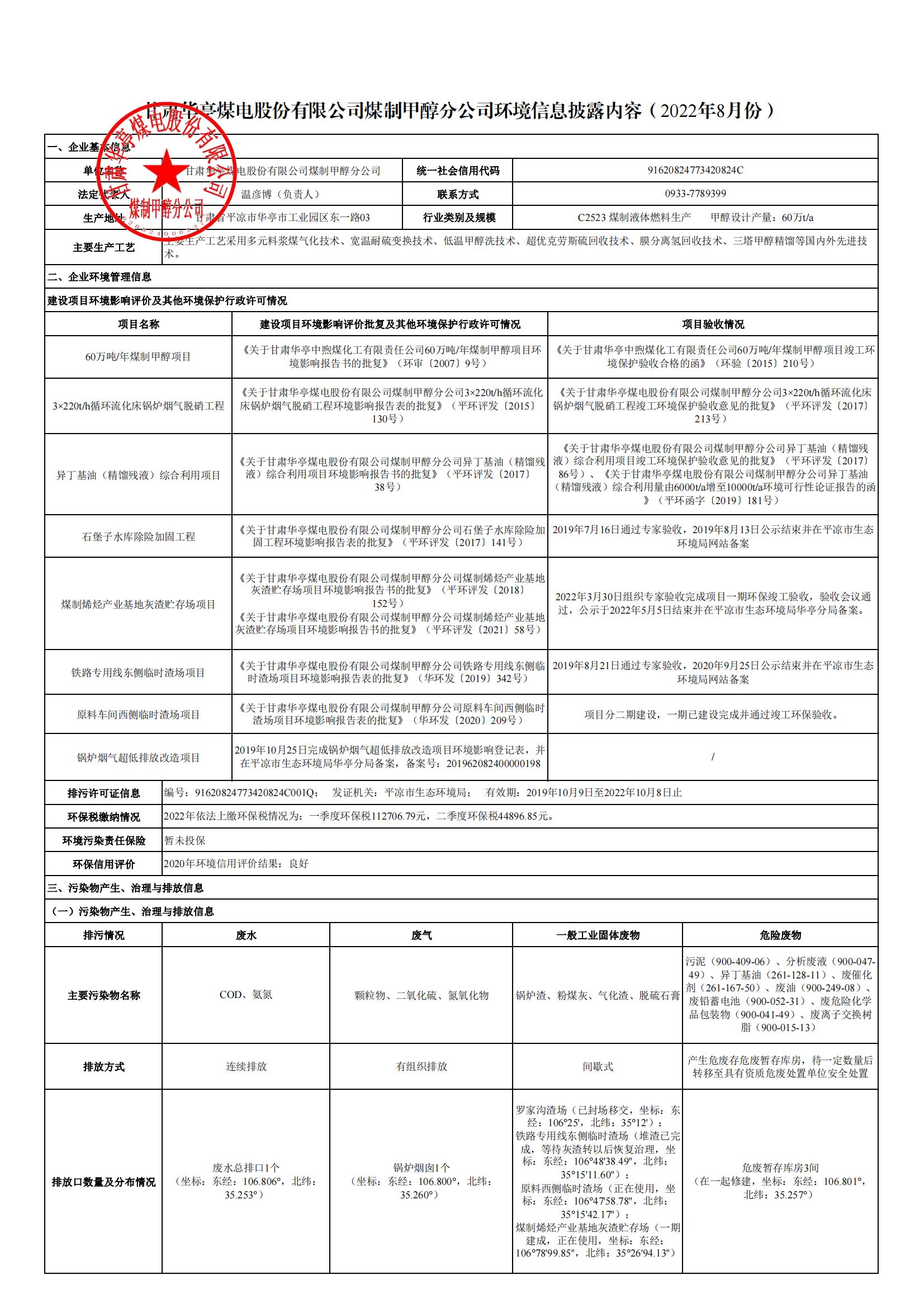 煤制甲醇分公司環(huán)境信息公開內(nèi)容(2022年8月)