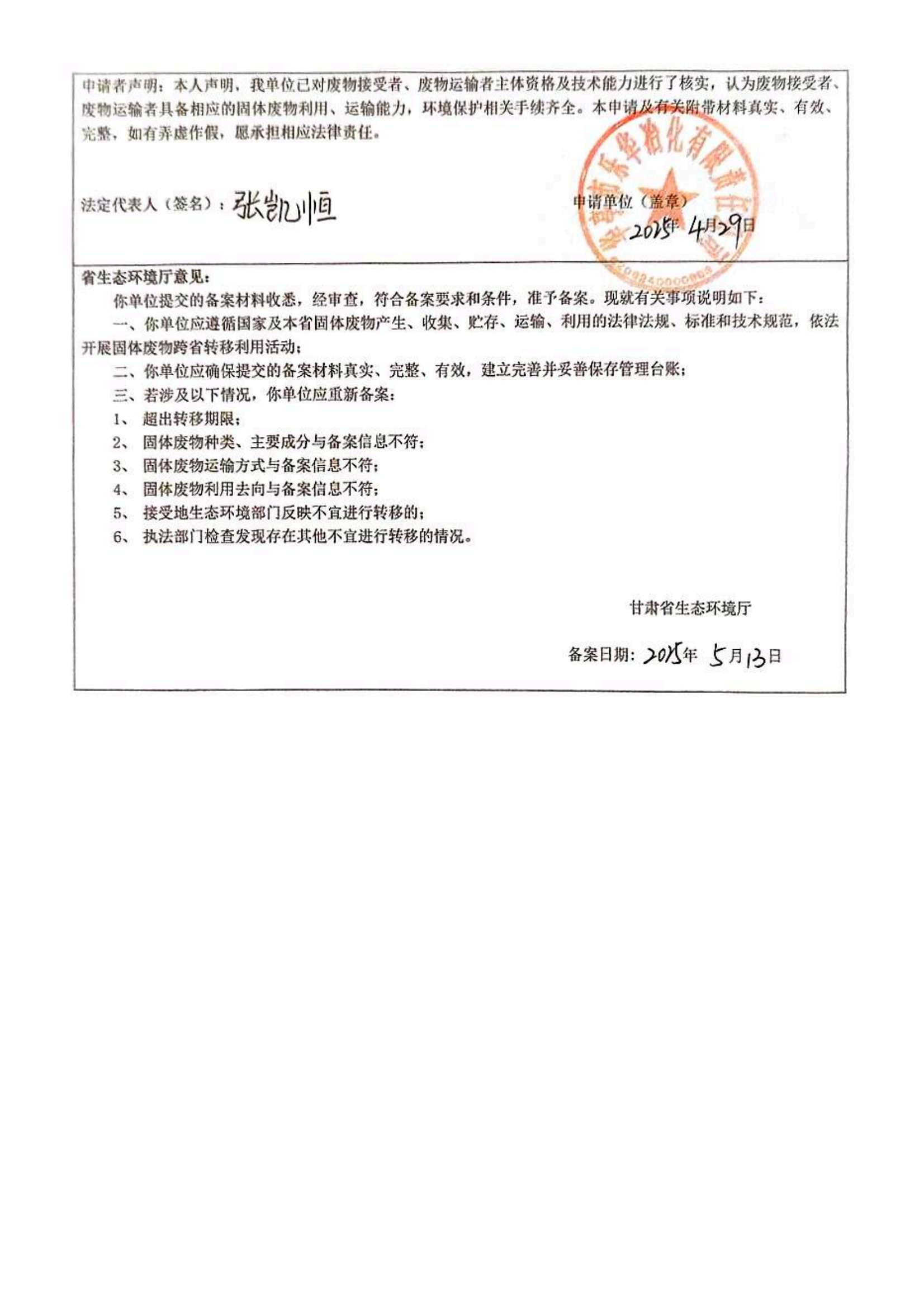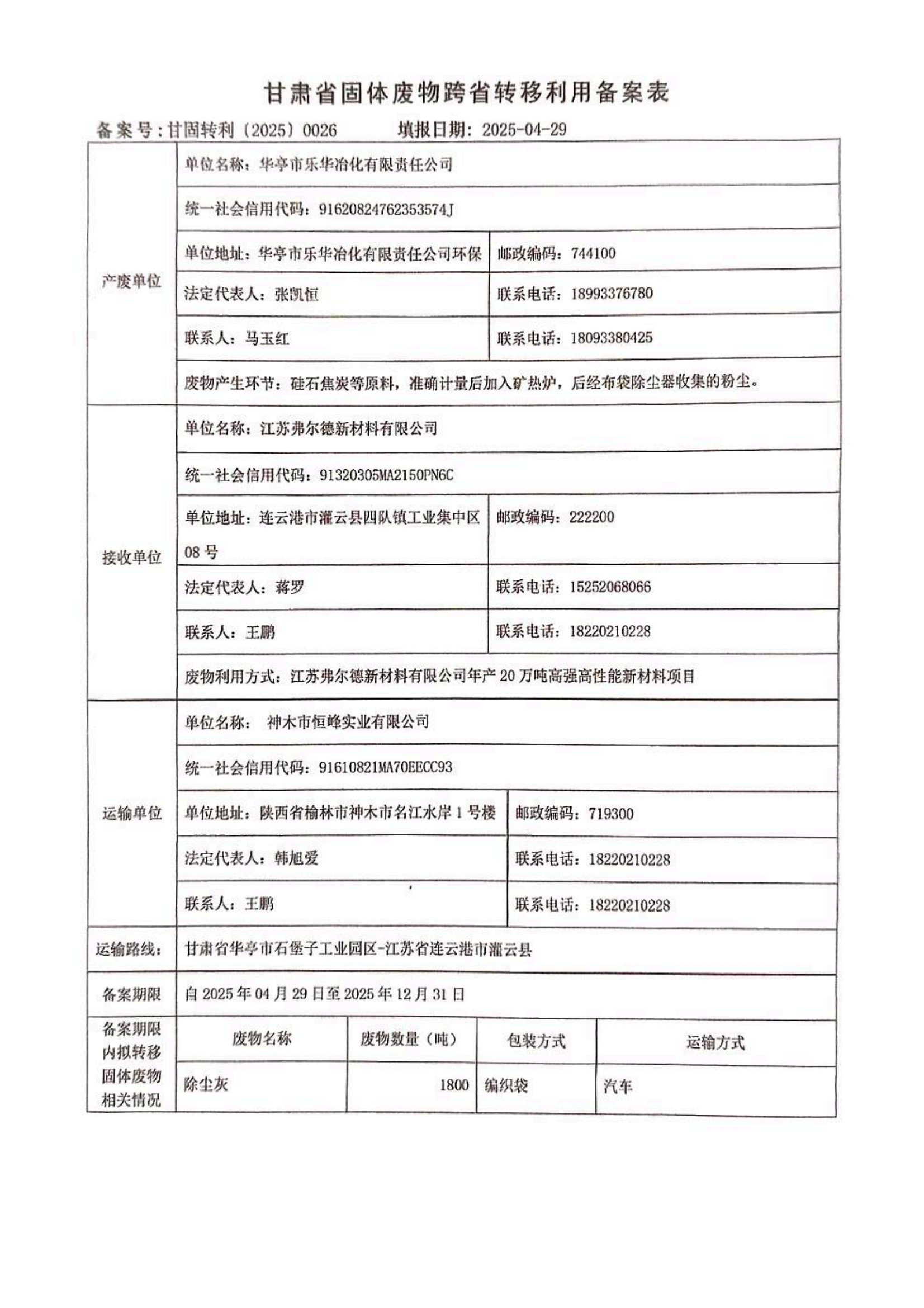 華亭市樂華冶化有限責(zé)任公司甘肅省固體廢物跨省轉(zhuǎn)移利用備案表